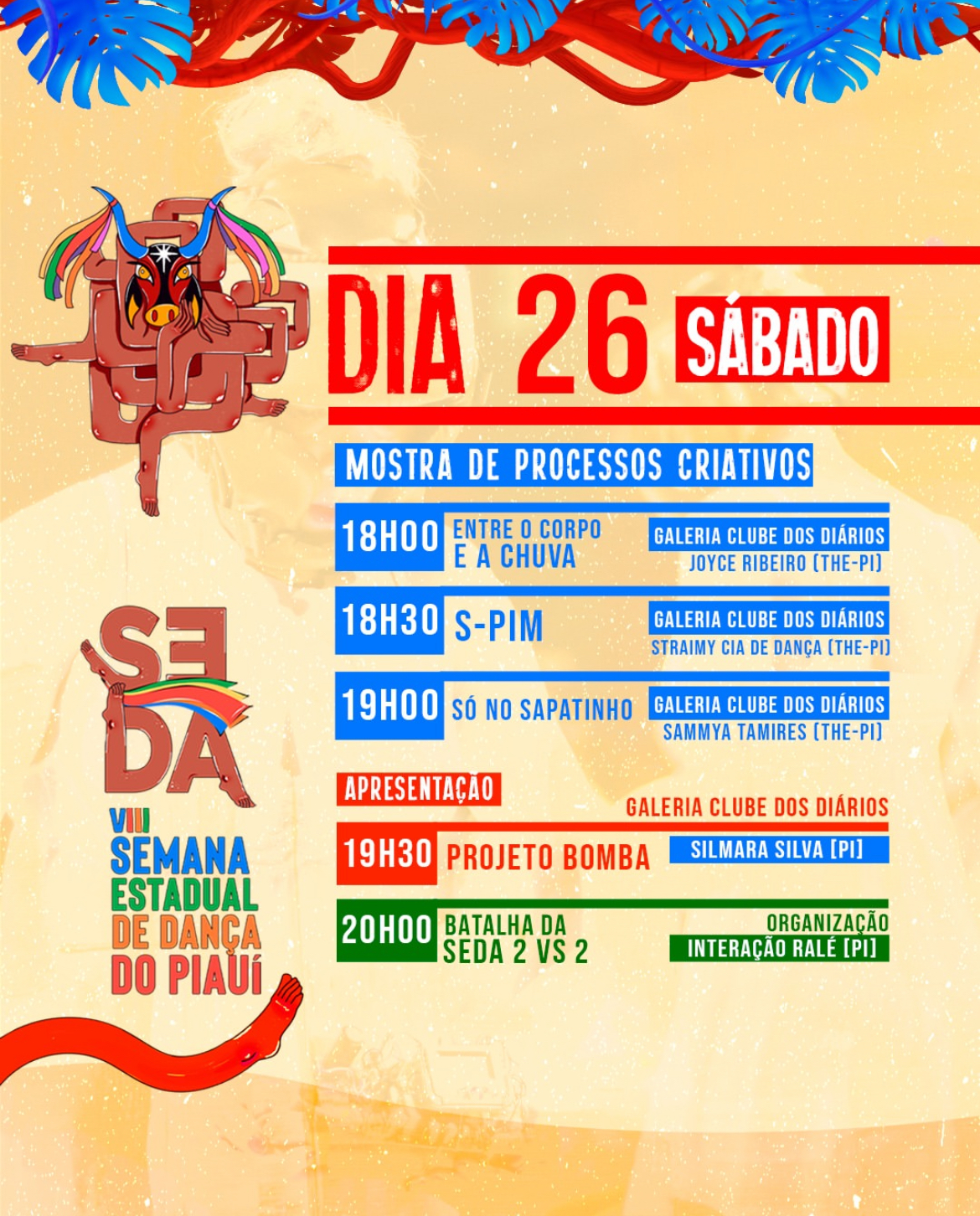 • 18h – Mostra de Processos: “Entre o Corpo e a Chuva”, solo de Joyce de Ribeiro, na Galeria do Clube dos Diários. Um mergulho poético nas relações entre corpo e ambiente.