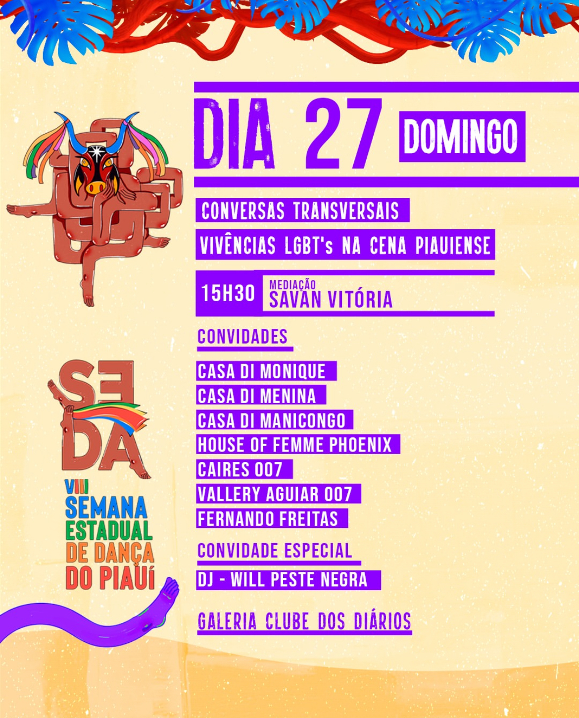 • 15h30 – Conversas Transversas: Vivências LGBTs na Cena Piauiense, com mediação de Savan Vitória, trazendo relatos, experiências e diálogos sobre presença e criação, na galeria Clube dos Diários.