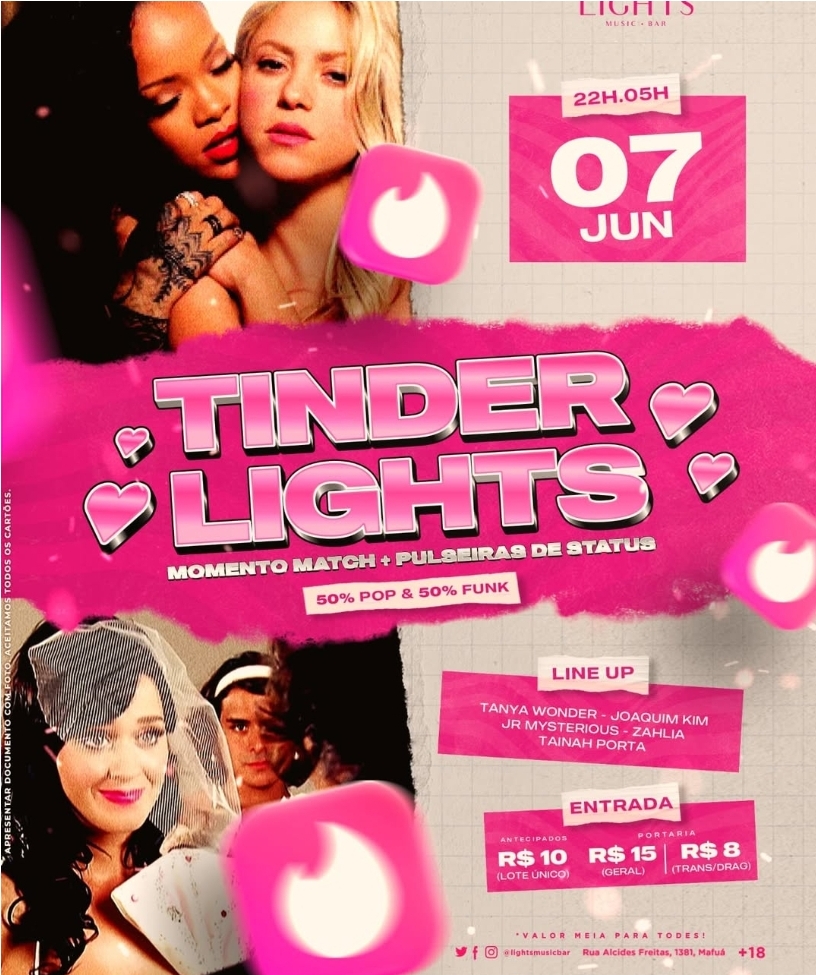 Sábado (7): Tinder Lights — o rolê ideal pra quem tá na pista