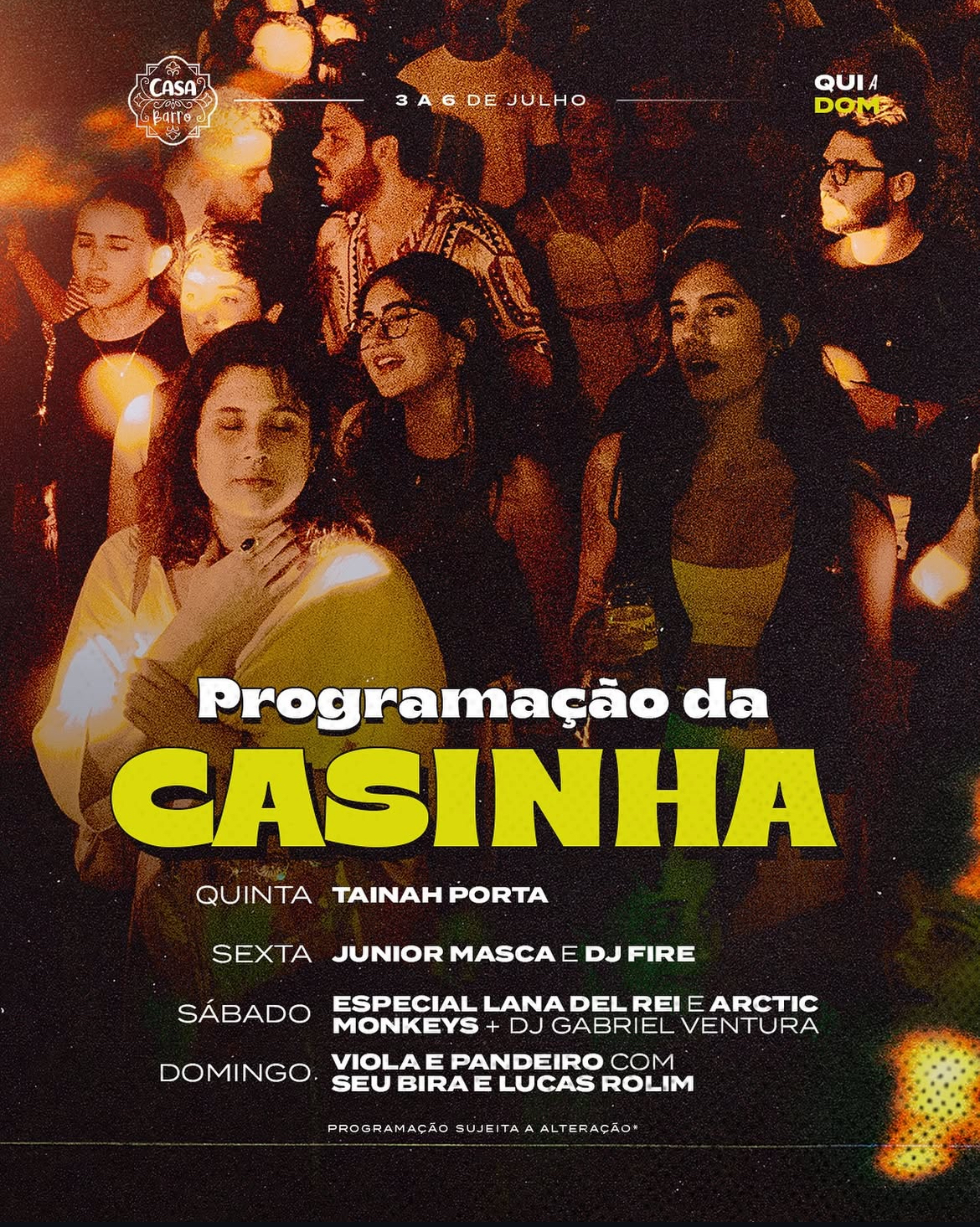 • Sábado (5): o clima é de indie e nostalgia com um especial Lana Del Rey, show da banda Arctic Monkeys Tribute e set especial de DJ Gabriel Ventura.